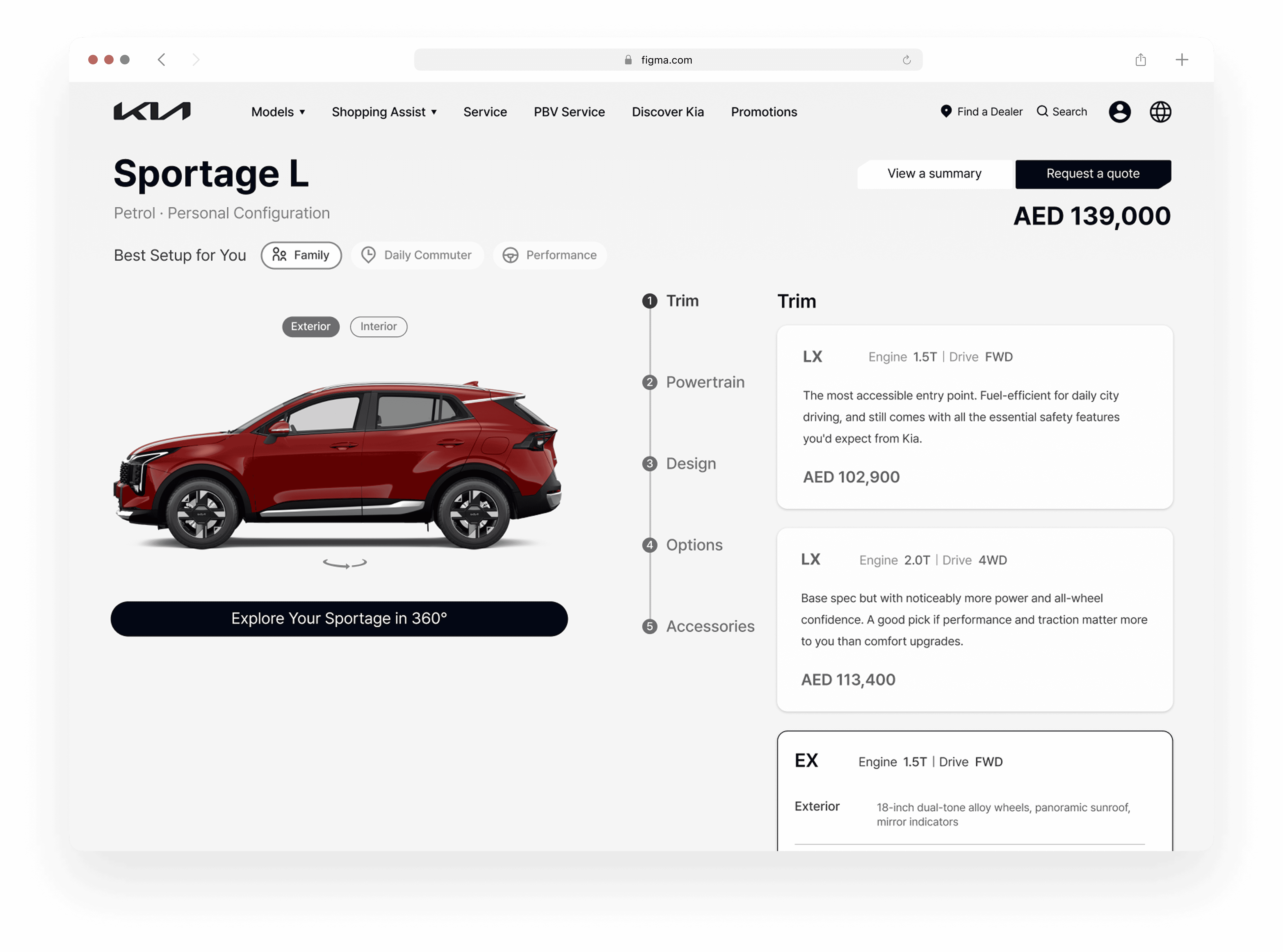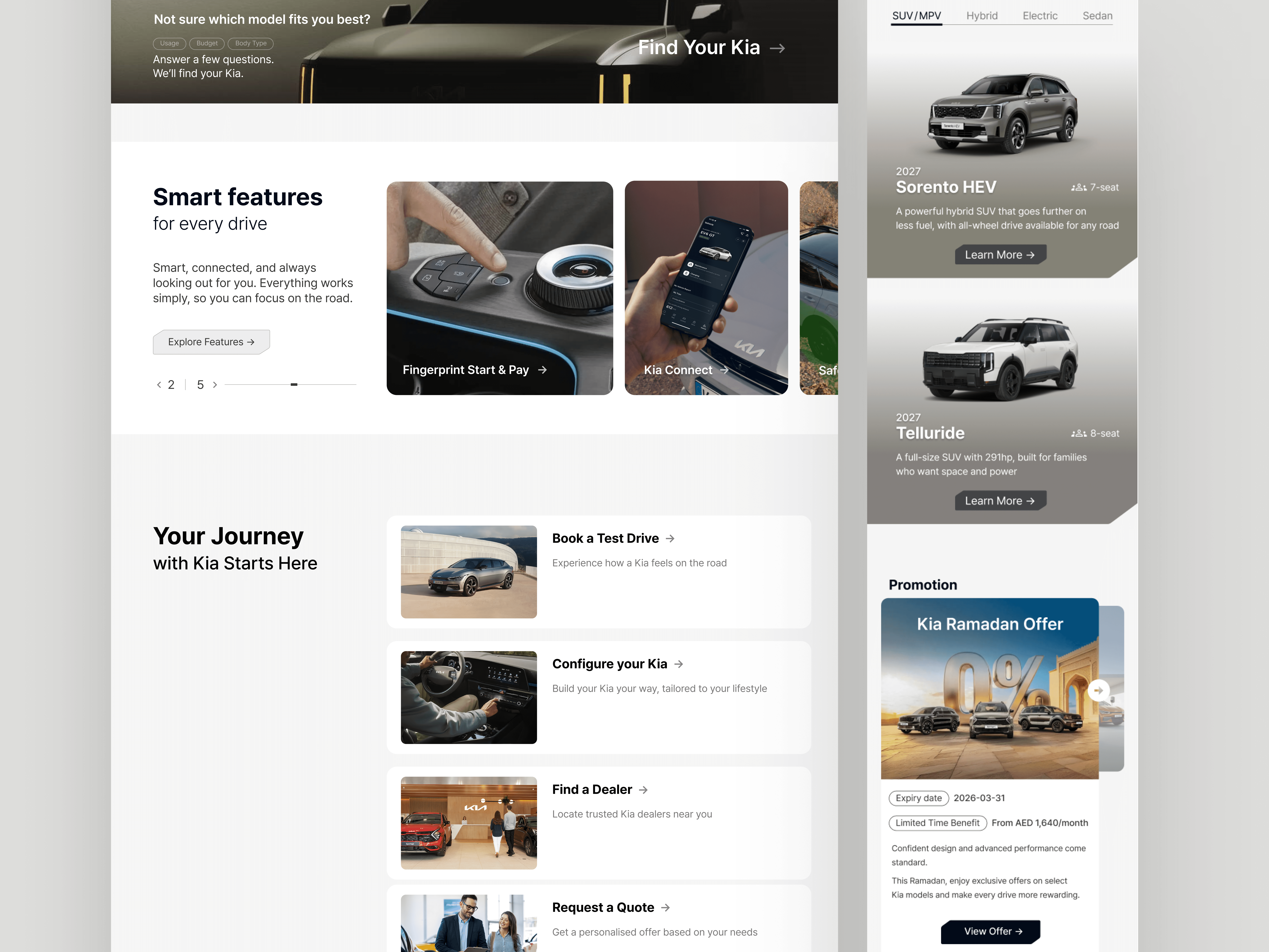 This was a freelance UX/UI project commissioned through a Dubai-based digital agency. The brief was to audit the existing regional website and redesign three core pages: the homepage, vehicle detail page (VDP), and a car configurator, with a focus on clarity, usability, and alignment with global Kia design standards.